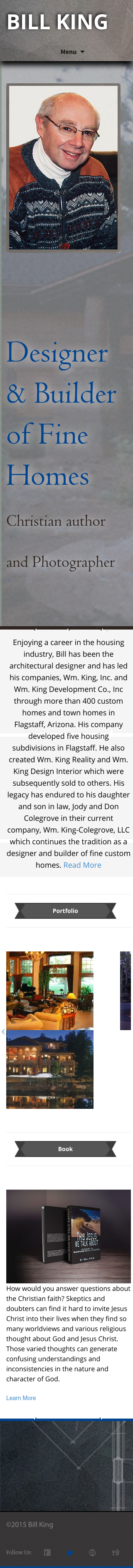 Enjoying a career in the housing industry, Bill has been the builder and architectural designer which has led his building companies, Wm. King, Inc. and Wm. King Development Co., Inc through more than 400 custom homes and town homes in Flagstaff, Arizona. His company developed five housing subdivisions in Flagstaff. He also created Wm. King Reality and Wm. King Design Interior which were subsequently sold to others. His legacy has inured to his daughter and son-in-law, Jody and Don Colegrove through their current company, Wm. King-Colegrove, LLC which continues the tradition as a designer and builder of fine custom homes.